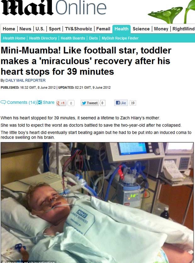 Seu coração voltou a bater, mas ele teve de ser induzido ao coma para evitar danos a seu cérebro.